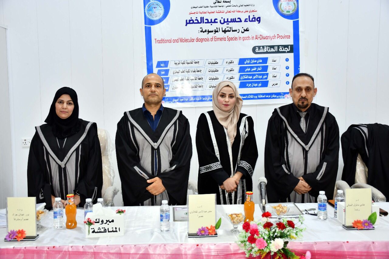 ناقشت رسالة ماجستير في كلية الطب البيطري بجامعة القادسية دراسة مظهرية وجزيئية لأنواع الاميريا في الماعز المحلي في محافظة الديوانية للطالبة وفاء حسين عبد الخضر الفتلاوي