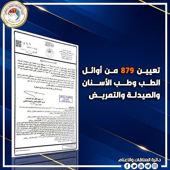 أصدر وزير التعليم العالي والبحث العلمي الأستاذ الدكتور نبيل كاظم عبد الصاحب أمرا وزاريا بتعيين ثمانمئة وتسعة وسبعين من الأوائل في تخصصات الطب وطب الاسنان والصيدلة والتمريض.