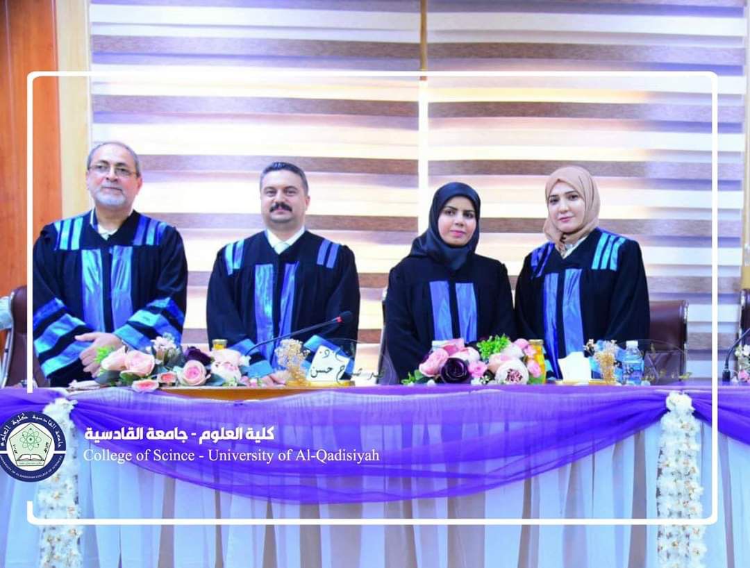 ناقشت رسالة ماجستير في قسم علوم الرياضيات بكلية العلوم في جامعة القادسية دراسة تحليل التدفق التمعجي لسائل جيفري خلال قناة مرنة ( Analysis of a Peristaltic Flow for Jeffrey Fluid Through a Flexible Channel )للطالبة نور الهدى كريم كاظم الخالدي