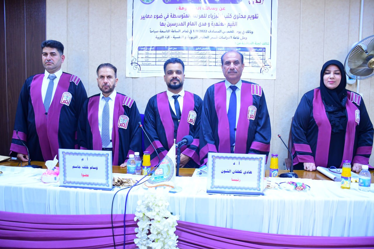 ناقشت رسالة الماجستير في كلية التربية جامعة القادسية والموسومة (تقويم محتوى كتب الفيزياء للمرحلة المتوسطة في ضوء معايير القيم العلمية ومدى المام المدرسين بها )للطالب مصطفى فالح ندى الجنابي بأشراف الاستاذ المساعد الدكتور عقيل امير جبر .