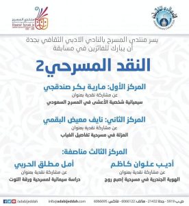 تضمنت المسابقة التي أقامها منتدى المسرح بالنادي الادبي الثقافي بجدة مشاركات بحثية وأوراق نقدية من مختلف دول الوطن العربي اختصت في المسرح السعودي .