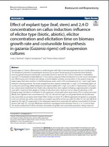 Effect of explant type (leaf, stem) and 2,4‑D concentration on callus induction: influence of elicitor type (biotic, abiotic), elicitor concentration and elicitation time on biomass growth rate and costunolide biosynthesis in gazania (Gazania rigens) cell suspension cultures