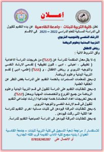تعلن كلية التربية للبنات – جامعة القادسية عن بدء التقديم للقبول في الدراسة المسائية للعام الدراسي 2022 – 2023 في