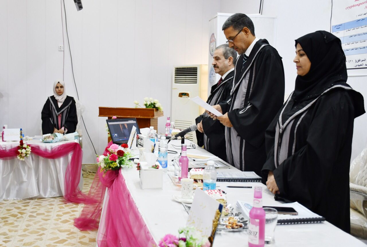 ناقشت رسالة ماجستير في كلية الطب البيطري بجامعة القادسية الفحص التقليدي والجزيئي للأنواع الابواغ الخبيئة في البشر والقطط في محافظة الديوانية للطالبة نجود عبد الرزاق جاسم العلي