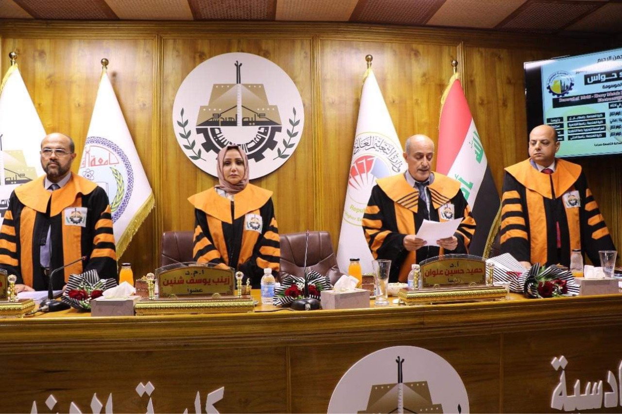 ناقش قسم الهندسة الكيمياوية في كلية الهندسة بجامعة القادسية رسالة الماجستير الموسومة ( إزالة معادن ثقيلة متعددة من مياه محاكاة باستخدام تقنية التخثير الكهربائي ) للطالبة زهراء علاء حواس بإشراف أم.د فرات ياسر شراد