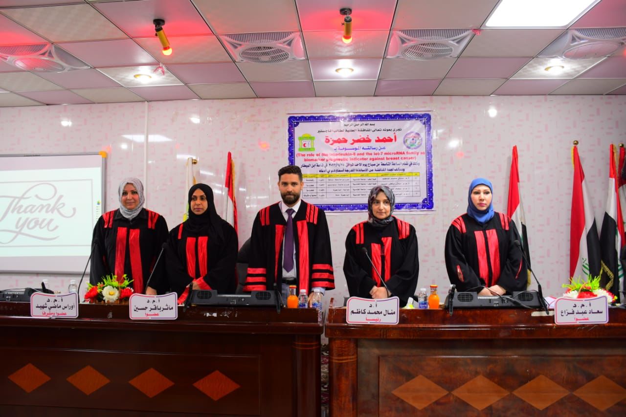 نوقشت في كلية الطب بجامعة القادسية رسالة الماجستير الموسومة ب( دور الإنترلوكين 8 و-7 Family let-MiRNA كعلامات حيوية ومؤشرات تنبؤية ضد سرطان الثدي ) للطالب احمد خضر حمزة تحت اشراف أ.م.د.أوراس ماضي شهيد
