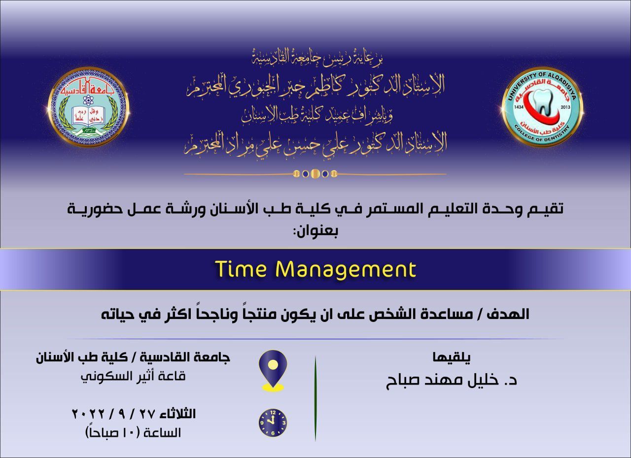 برعاية السيد رئيس جامعة القادسية الأستاذ الدكتور كاظم جبر الجبوري المحترم وباشراف السيد عميد كلية طب الاسنان