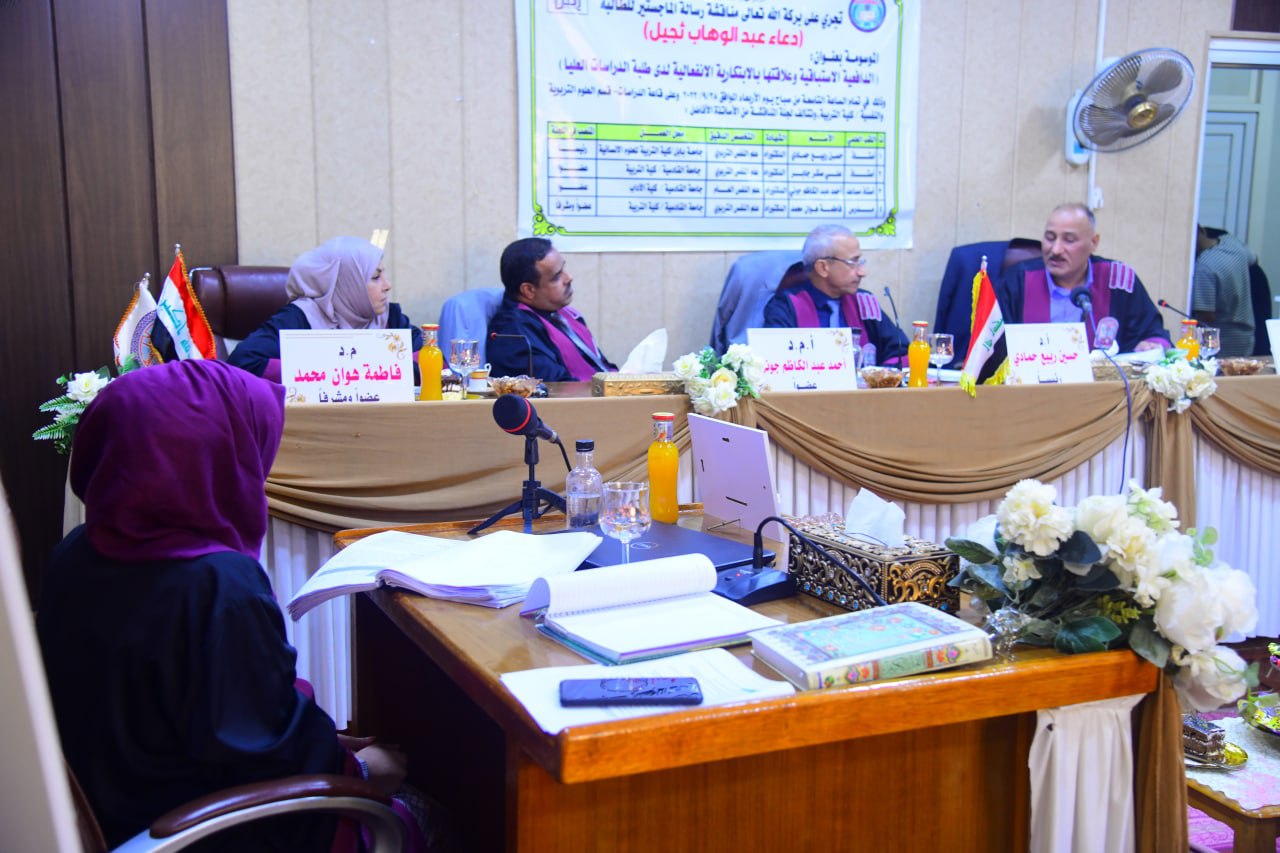 ناقشت رسالة الماجستير في كلية التربية جامعة القادسية والموسومة (الدافعية الاستباقية وعلاقتها بالابتكارية الانفعالية لدى طلبة الدراسات العليا ) للطالبة دعاء عبد الوهاب ثجيل بإشراف الاستاذة الدكتورة فاطمة هوان محمد .