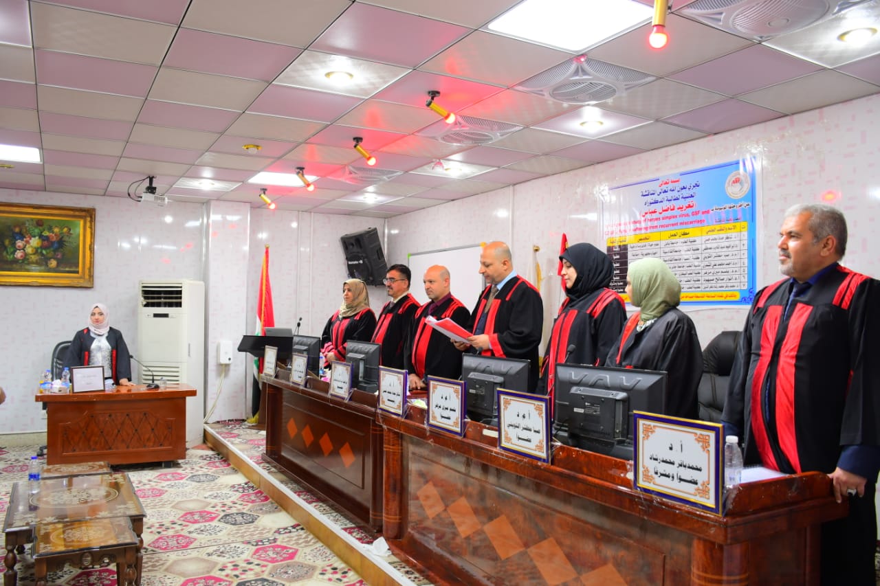 ناقشت أطروحة الدكتوراه في في كلية الطب بجامعة القادسية والموسومة بعنوان(دراسة مناعية لفيروس الهربس البسيط والعامل المحفز لمستعمرات المحببات ومجموعة التمايز 56 للنساء اللاتي يعانين من الإجهاض المتكرر) لطالبة الدراسات العليا في ألاحياء المجهرية تغريد فاضل عباس إبراهيم بأشراف :