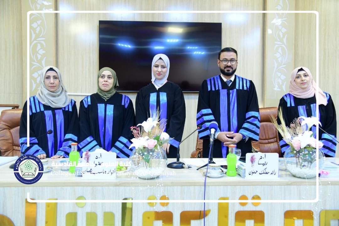 ناقشت رسالة ماجستير في قسم الكيمياء بكلية العلوم في جامعة القادسية تحليل التعبير الجيني ل microRNA_122 كمؤشر حيوي للإجهاد التأكسدي والالتهابات في مرضى التمثيل الغذائي للطالبة رقية سعد رضا.