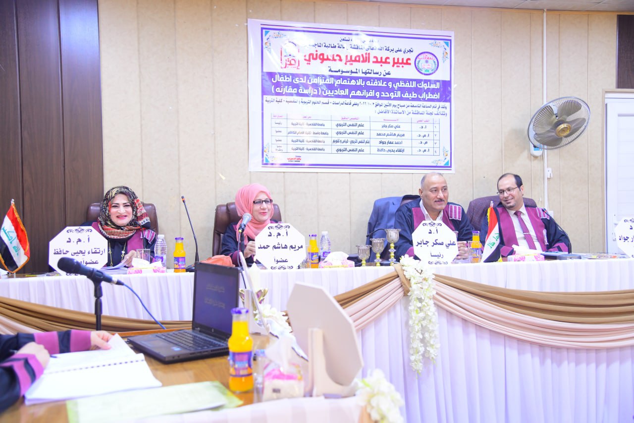 ناقشت رسالة الماجستير في كلية التربية جامعة القادسية والموسومة (السلوك اللفظي وعلاقته بالاهتمام المتزامن لدى أطفال اضطراب طيف التوحد وأقرانهم العاديين (دراسة مقارنة)) للطالبة عبير عبد الأمير حسوني السعدي