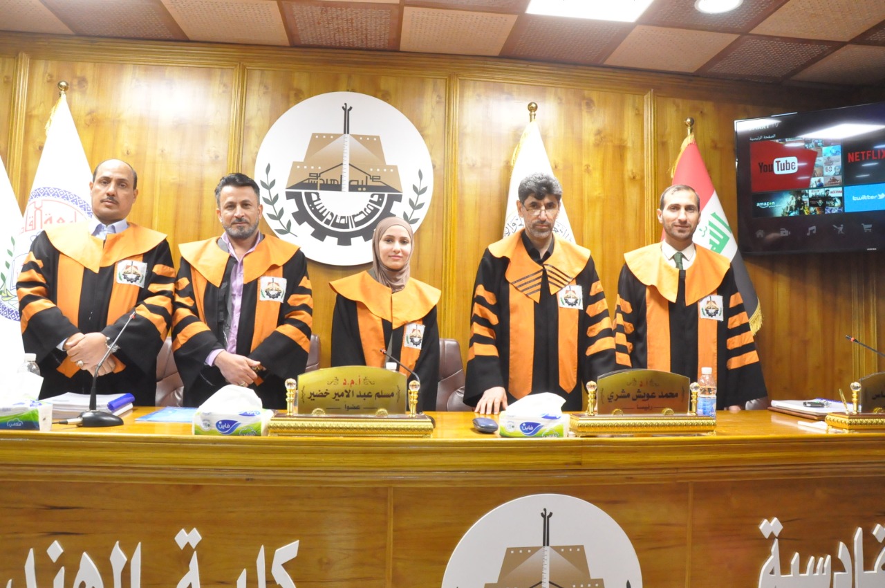 ناقش قسم الهندسة المدنية في كلية الهندسة بجامعة القادسية رسالة الماجستير الموسومة (سلوك القص للروافد الفولاذية الصفائحية ذات الوترات المتموجة المائلة )