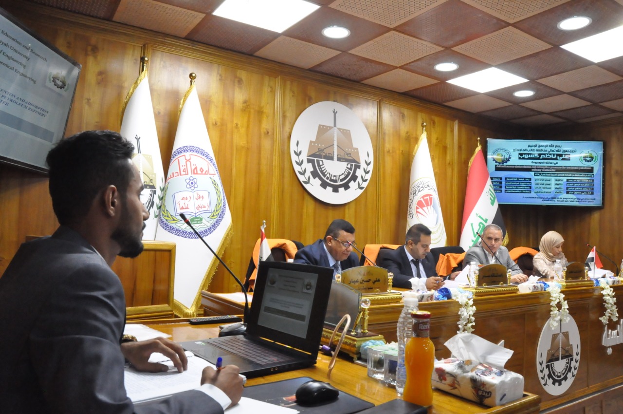 ناقش قسم الهندسة الكيمياوية في كلية الهندسة بجامعة القادسية رسالة الماجستير الموسومة(عمليات الالكتروفنتون والامتزاز المتزامنة لمعالجة مياه الصرف الصحي لتكرير البترول) للطالب علي ناظم وبإشراف