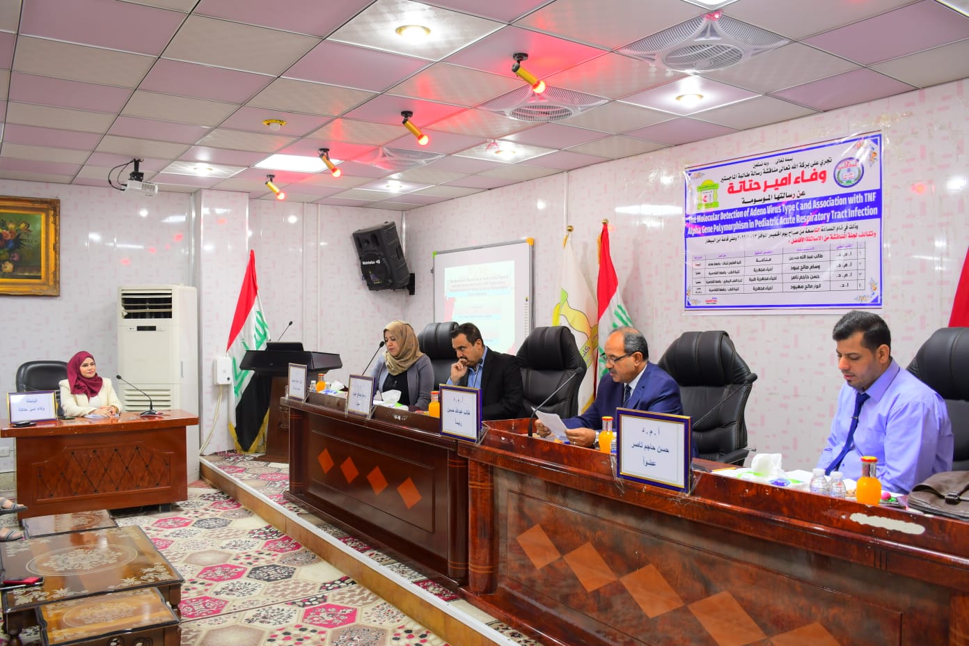 ناقشت رسالة الماجستير في كلية الطب بجامعة القادسية والموسومة (الكشف الجزيئي عن الفيروس الغدي من النمط C والارتباط بتعدد الأشكال الجيني في العامل المناعي Tumor necrosis factor-α في الأطفال المصابين بعدوى حادة في الجهاز التنفسي) لطالبة الماجستير في اختصاص الاحياء المجهرية الطبية وفاء امير حتاته باشراف الاستاذ الدكتور انوار صالح صيهود