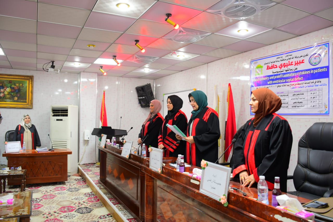 ناقشت رسالة الماجستير في كلية الطب بجامعة القادسية والموسومة بعنوان (CD4+CD20 T cell وعلاقتها مع مستوى السايتوكيين لمرضى العيب الحاجز البطيني للقلب) لطالبة الدراسات العليا في اختصاص الأحياء المجهرية عبير عليوي حافظ وبأشراف ا.م.د. اسراء