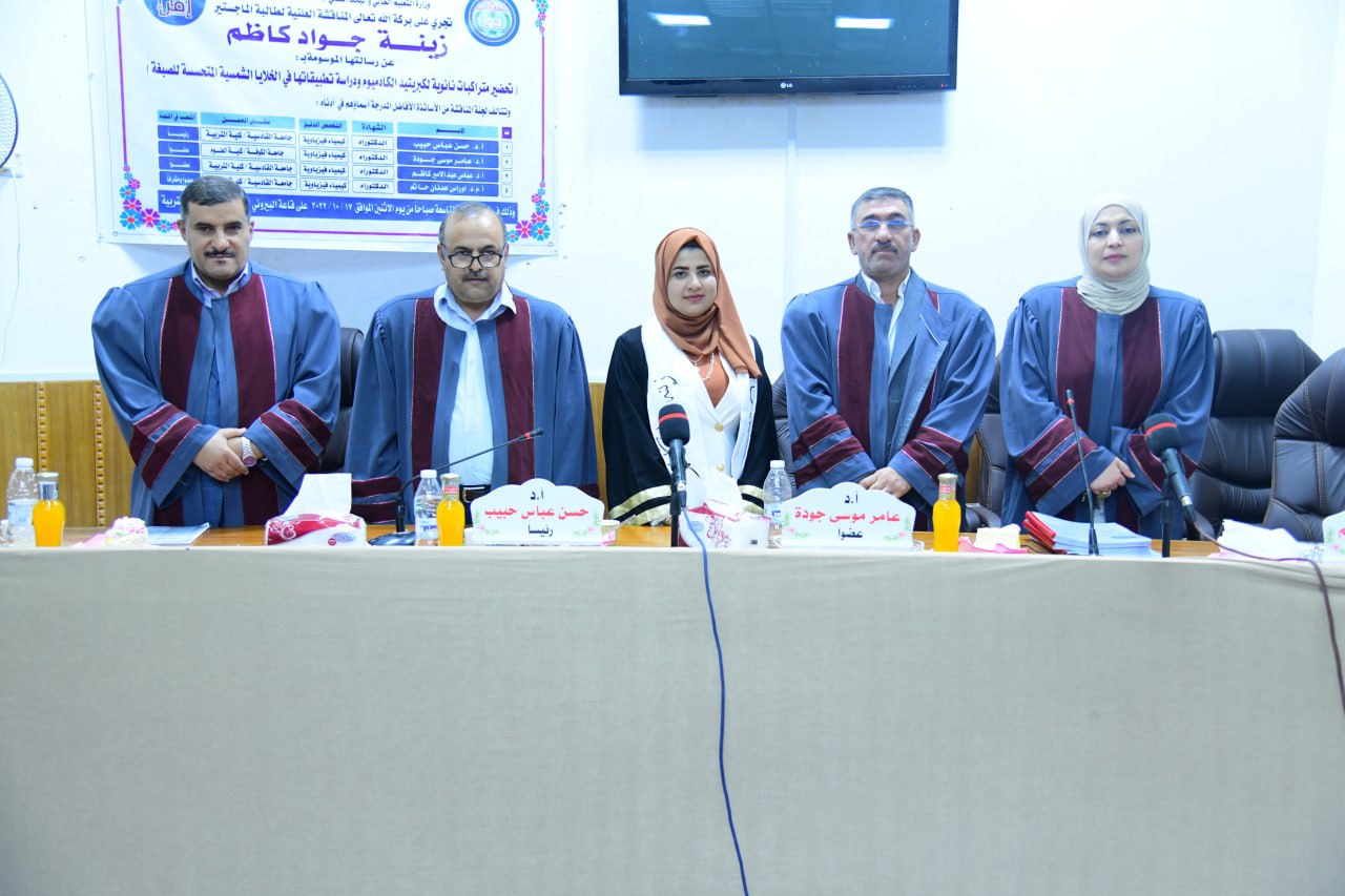 ناقشت رسالة الماجستير في كلية التربية بجامعة القادسية والموسومة(تحضير متراكبات نانوية لكبريتيد الكادميوم ودراسة تطبيقاتها في الخلايا الشمسية المتحسسة للصبغة)