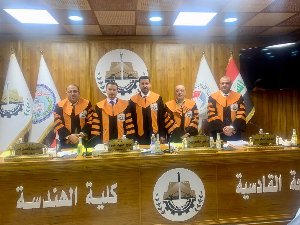ناقش قسم الهندسة الميكانيكية في كلية الهندسة بجامعة القادسية رسالة الماجستير الموسومة (انتقال الحرارة في تجويف مستطيل مائل مملوء بسائل نانوي هجين في جدار عمودي مسخن مع PCM)للطالب مقداد فالح حسن المالكي بإشراف أ.م.د. خالد عبد الحسين جبير .