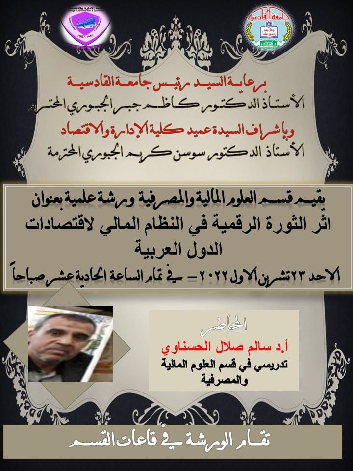عقد قسم العلوم المالية والمصرفية ورشة علمية بعنوان (أثر الثورة الرقمية في النظام المالي لاقتصادات الدول العربية .. العراق انموذجا) وحاضر فيها الأستاذ الدكتور سالم صلال راهي الحسناوي.