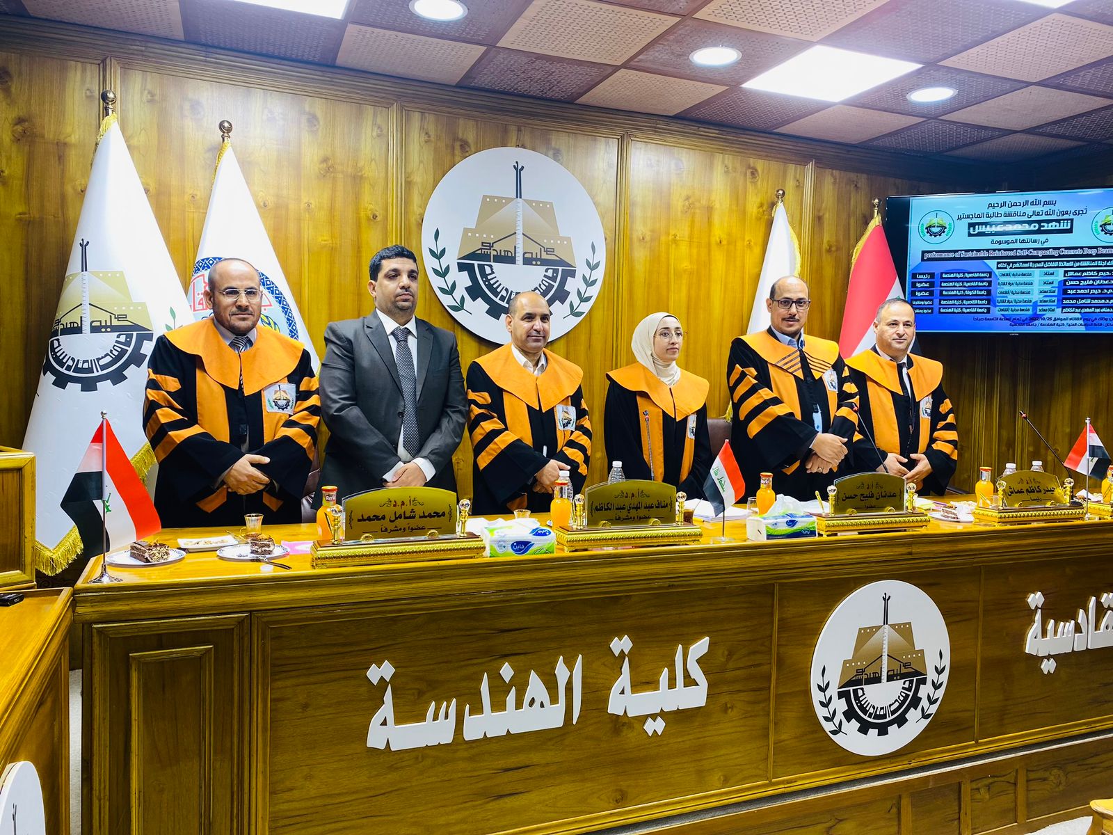 ناقش قسم الهندسة المدنية في كلية الهندسة بجامعة القادسية رسالة الماجستير الموسومة (الأداء الهيكلي للعوارض الخرسانية المسلحة ذاتية الرص العميقة المستدامة ) للطالبة شهد محمد عبيس بإشراف