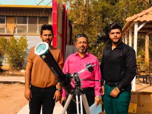 وتوزيع النظارات الخاصة بالكسوف على الطلبة لمشاهدة الكسوف وكذلك رصده بواسطة التلكسوب بطريقتين الاولى الاسقاط الضوئي لصورة الشمس المكسوفة من خلال عينية التلسكوب على ورقة بيضاء بحيث يشاهدها جميع الطلبة.والطريقة الثانية هي النظر المباشر من خلال عينة سكوب بعد وضع فلتر شمسي خاص على عدسة التلسكوب .