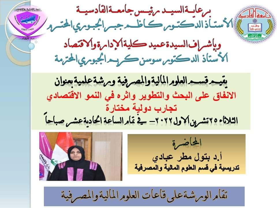(الانفاق على البحث والتطوير واثره في النمو الاقتصادي -تجارب دولية مختارة) حاضرت فيها : الأستاذ الدكتور بتول مطر عبادي.