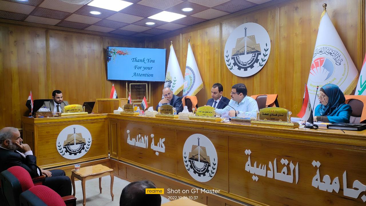 ناقش قسم الهندسة المدنية في كلية الهندسة بجامعة القادسية رسالة الماجستير الموسومة (التصرف الانشائي للأعتاب الخرسانية المسلحة ذاتية الرص المستدامة المعززة بالألياف الهجينة) للطالب عبد الله حامد راضي بإشراف أ.م.د محمد شامل محمد .