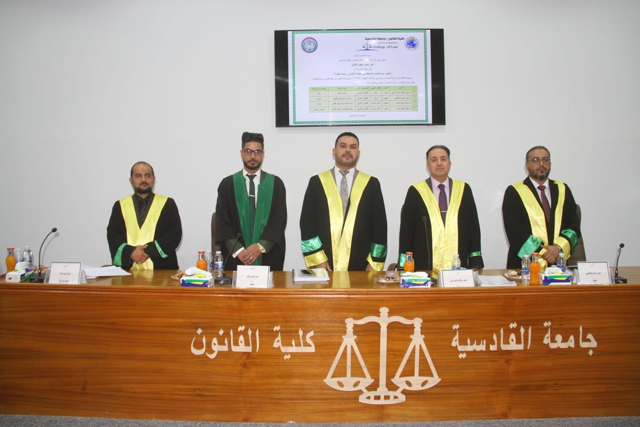 ناقشت رسالة الماجستير في كلية القانون بجامعةالقادسية الموسومة بعنوان ( العدول عن المبادئ المستقرة في القضاء الإداري _ دراسة مقارنة) للطالب أمير عدنان نغيش