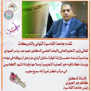 تقدم جامعة القادسية التهاني والتبريكات لمعالي وزير التعليم العالي والبحث العلمي الدكتور نعيم عبد ياسر العبودي بمناسبة تسنمه منصب وزارتنا الموقرة سائلين الباري عز وجل أن يوفقه في مهامه ويسدد خطاه لمافيه خير العملية التعليمية وصلاحها وقيادة المشهد الاكاديمي الى مراتب أكثر تميزاً إنه سميع مجيب.