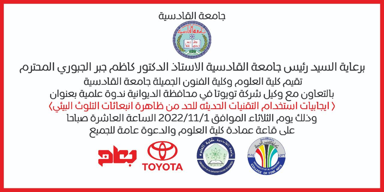 برعاية السيد رئيس جامعة القادسية الاستاذ الدكتور كاظم جبر الجبوري وتحت اشراف عميد كلية الفنون الجميلة الاستاذ الدكتور كاظم نوير الزبيدي وعميد كلية العلوم الاستاذ المساعد الدكتور سلوان علي الحمزاوي و بالتعاون مع وكيل شركة تويوتا في محافظة الديوانية …