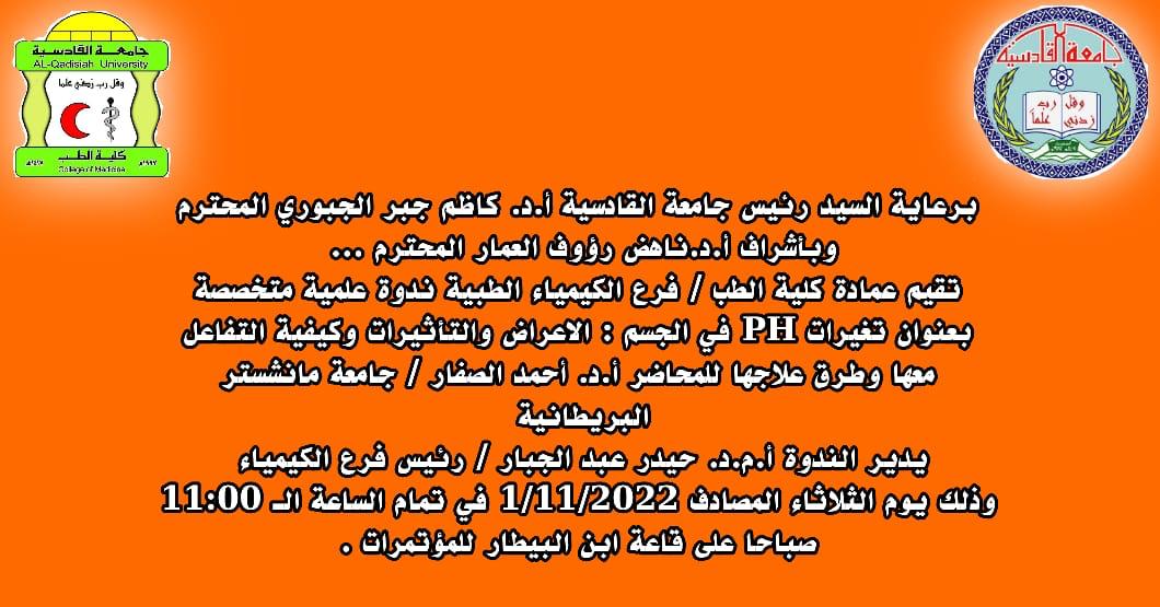 ستقيم عمادة كلية الطب / فرع الكيمياء الطبية ندوة علمية متخصصة بعنوان (تغيرات PH في الجسم الاعراض والتأثيرات وكيفية التفاعل معها وطرق علاجها) .