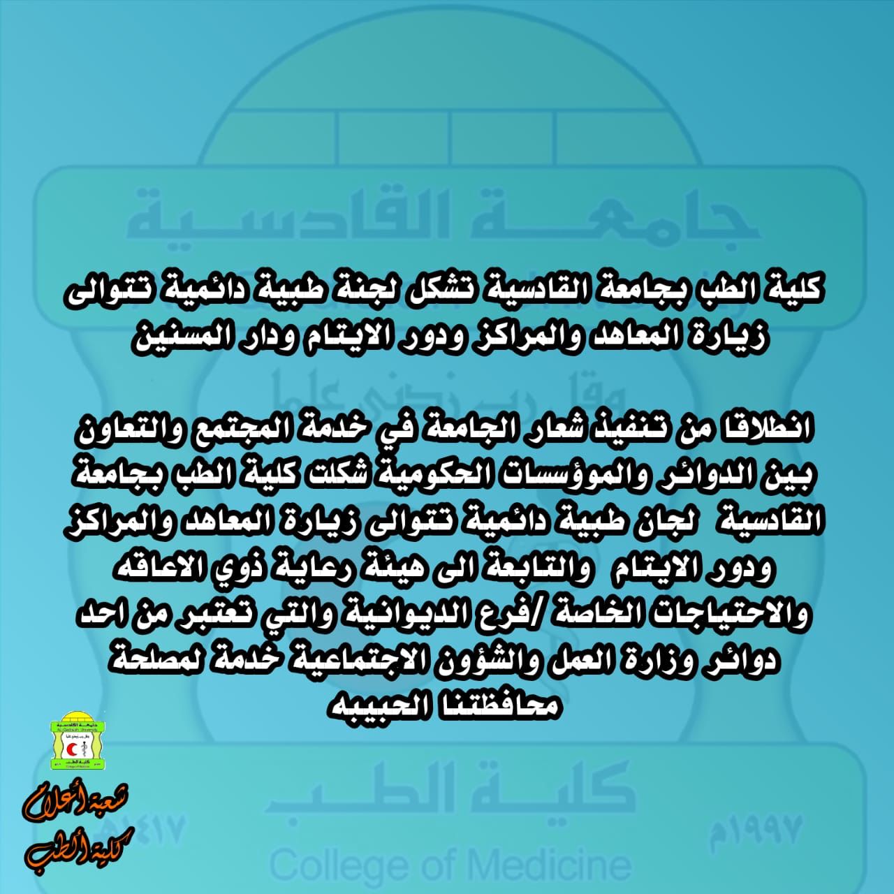 انطلاقا من تنفيذ شعار الجامعة في خدمة المجتمع والتعاون بين الدوائر والمؤسسات الحكومية شكلت كلية الطب بجامعة القادسية لجان طبية دائمية تتولى زيارة المعاهد والمراكز ودور الايتام والتابعة الى هيئة رعاية ذوي الاعاقه والاحتياجات الخاصة فرع الديوانية والتي تعتبر من احد دوائر وزارة العمل والشؤون الاجتماعية خدمة لمصلحة محافظتنا الحبيبة .