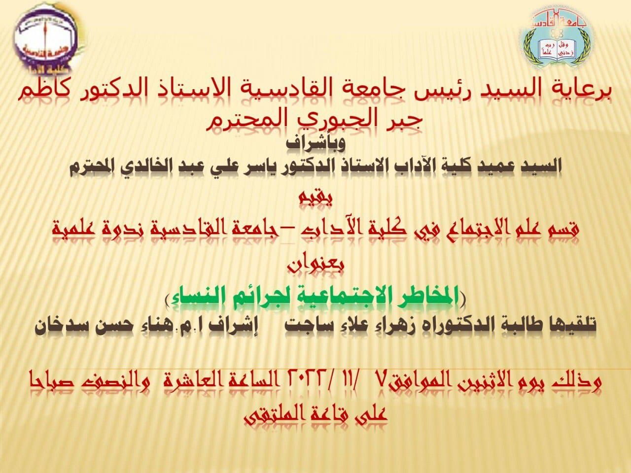 سيقيم قسم علم الاجتماع بكلية الاداب ندوة علمية بعنوان ( المخاطر الاجتماعية لجرائم النساء )