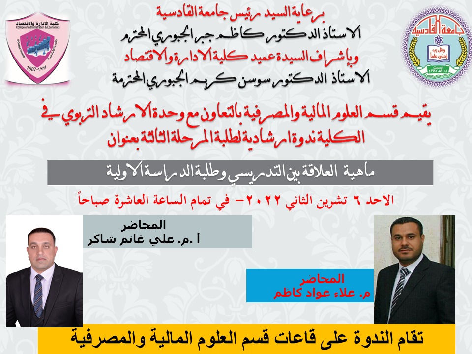أقام قسم العلوم المالية والمصرفية بالتعاون مع وحدة الإرشاد التربوي في كليتنا ندوة إرشاد تربوي لطلبة المرحلة الثالثة بعنوان (ماهية العلاقة بين التدريسي وطلبة الدراسة الاولية) .
