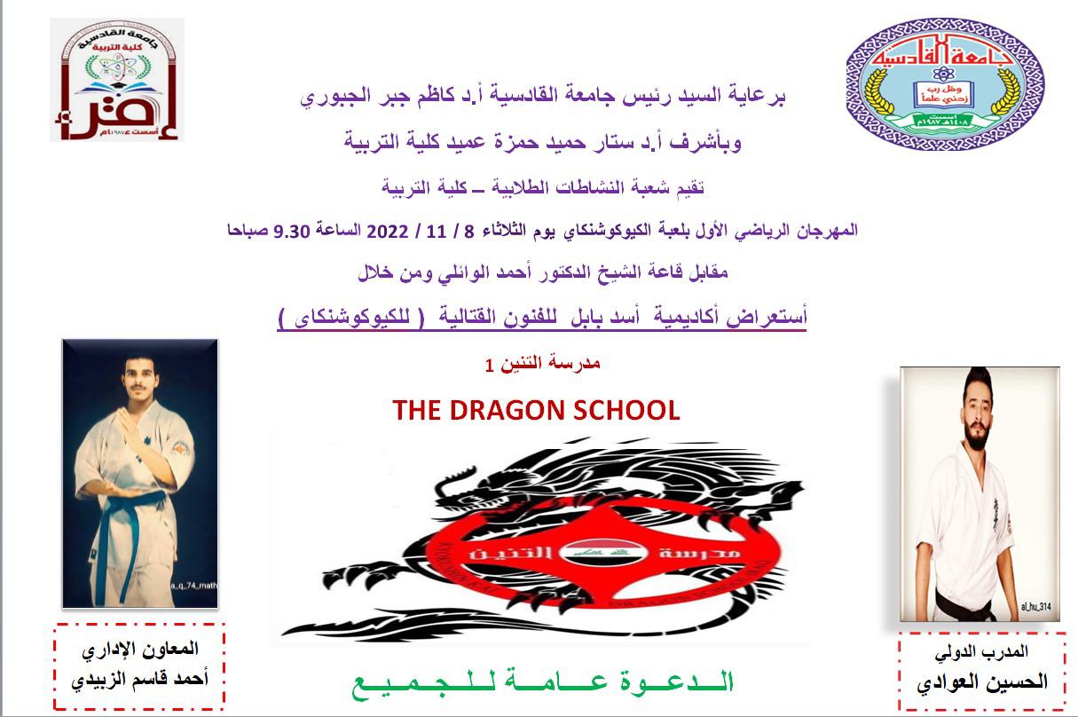 يعد المهرجان الأول على مستوى كليات جامعة القادسية من حيث أنواع فنون اللعبة واعداد المشاركين الكبيرة وبقيادة البطل والمدرب الدولي حسين العوادي صاحب الحزام الأسود 3 دان ويساعده الطالب احمد قاسم الزبيدي من قسم الرياضيات بكلية التربية وبمشاركة مجموعة لاعبين .
