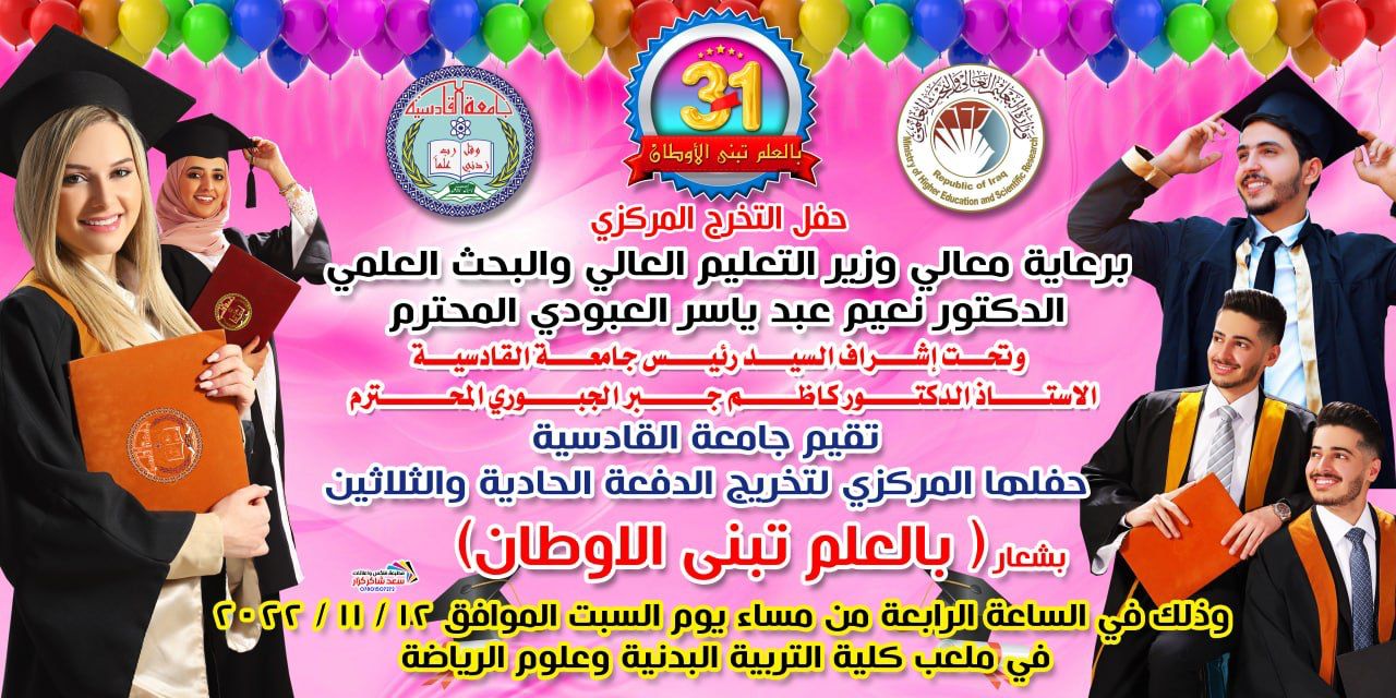 ستقيم جامعة القادسية حفلها المركزي لتخريج الدفعة الحادية والثلاثين موسومة بشعار (بالعلم تبنى الاوطان ) وذلك في الساعة الرابعة من مساء يوم السبت الموافق 12 / 11 / 2022 في ملعب كلية التربية البدنية وعلوم الرياضة .