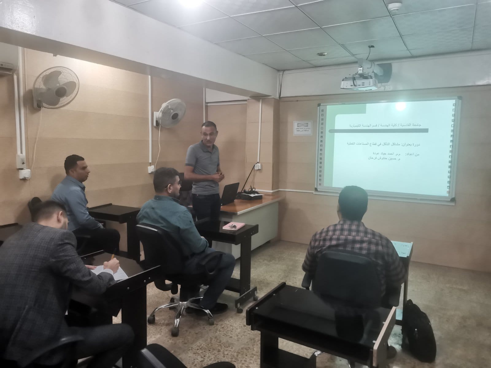 عقد قسم الهندسة الكيمياوية في كلية الهندسة بجامعة القادسية دورة علمية بعنوان (مشاكل التآكل في قطاع الصناعات النفطية) على قاعة وحدة التعليم المستمر حاضر فيها : م.م. احمد جياد عودة و م.حسين حنتوش فرحان