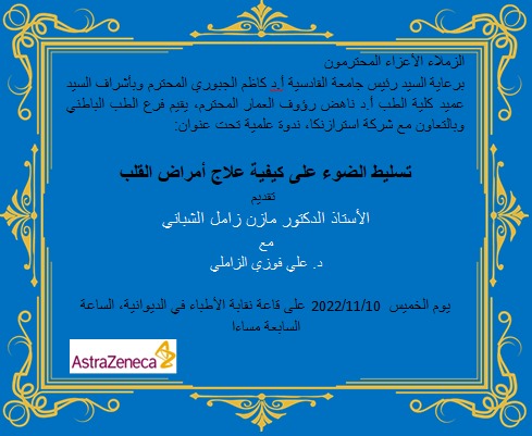 ستقيم عمادة كلية الطب فرع الباطنية ندوة علمية متخصصة بالتعاون مع شركة استرازنكا حول( تسليط الضوء على كيفية علاج امراض القلب)