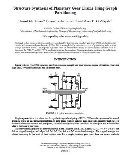 نشر التدريسي أ.د. عصام العيبي اسماعيل و أ.م.د. مآسي فيصل من كلية الهندسة بجامعة القادسية بحثا علميا والموسوم (التوليف الهيكلي لسلاسل التروس الكوكبية باستخدام طريقة تجزأة الرسم البياني) في مجلة المعهد الأمريكي للفيزياء العالمية الرصينة