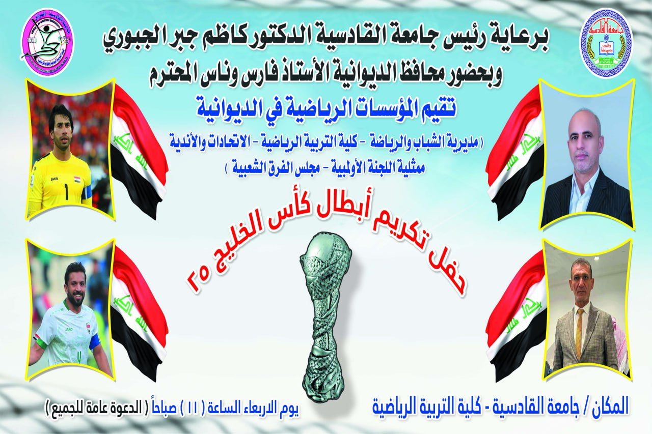 ستقيم كلية التربية البدنية وعلوم الرياضة بجامعة القادسية حفلاً تكريمياً للاحتفاء بالمنجز الكبير لمنتخبنا الوطني بمناسبة فوزه ببطولة خليجي 25 المقامة بمحافظة البصرة الفيحاء ، وذلك في الساعة الحادية عشرة من صباح يوم الاربعاء الموافق 1 / 2 / 2023 في القاعة المغلقة بكلية التربية البدنية وعلوم الرياضة.