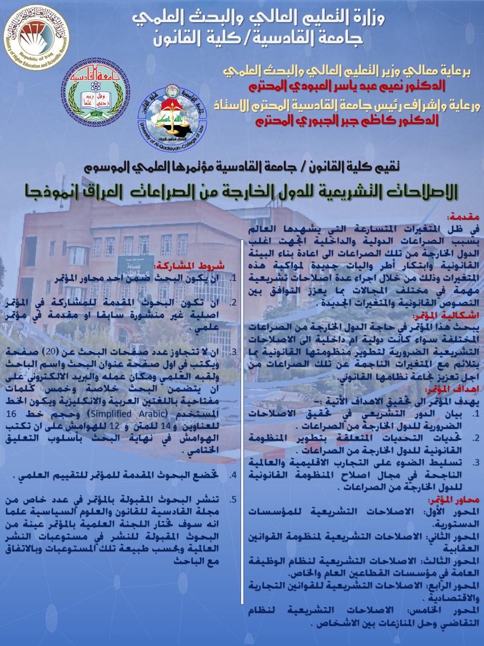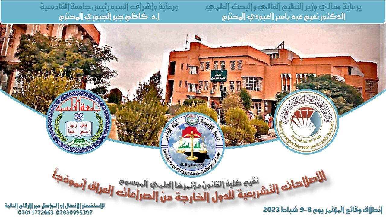 تقيم كلية القانون جامعة القادسية مؤتمرها العلمي الموسوم ( الاصلاحات التشريعية للدول الخارجة من الصراعات – العراق إنموذجا ) وذلك يومي 8 -9 / 2 / 2023 .