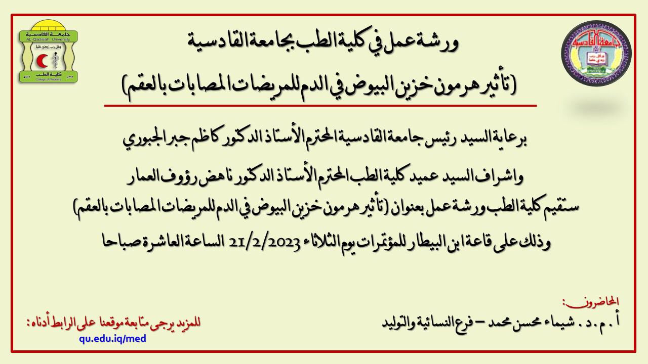 برعاية السيد رئيس جامعة القادسية الاستاذ الدكتور كاظم جبر الجبوري وباشراف السيد عميد كلية الطب الاستاذ الدكتور ناهض رؤوف العمار .