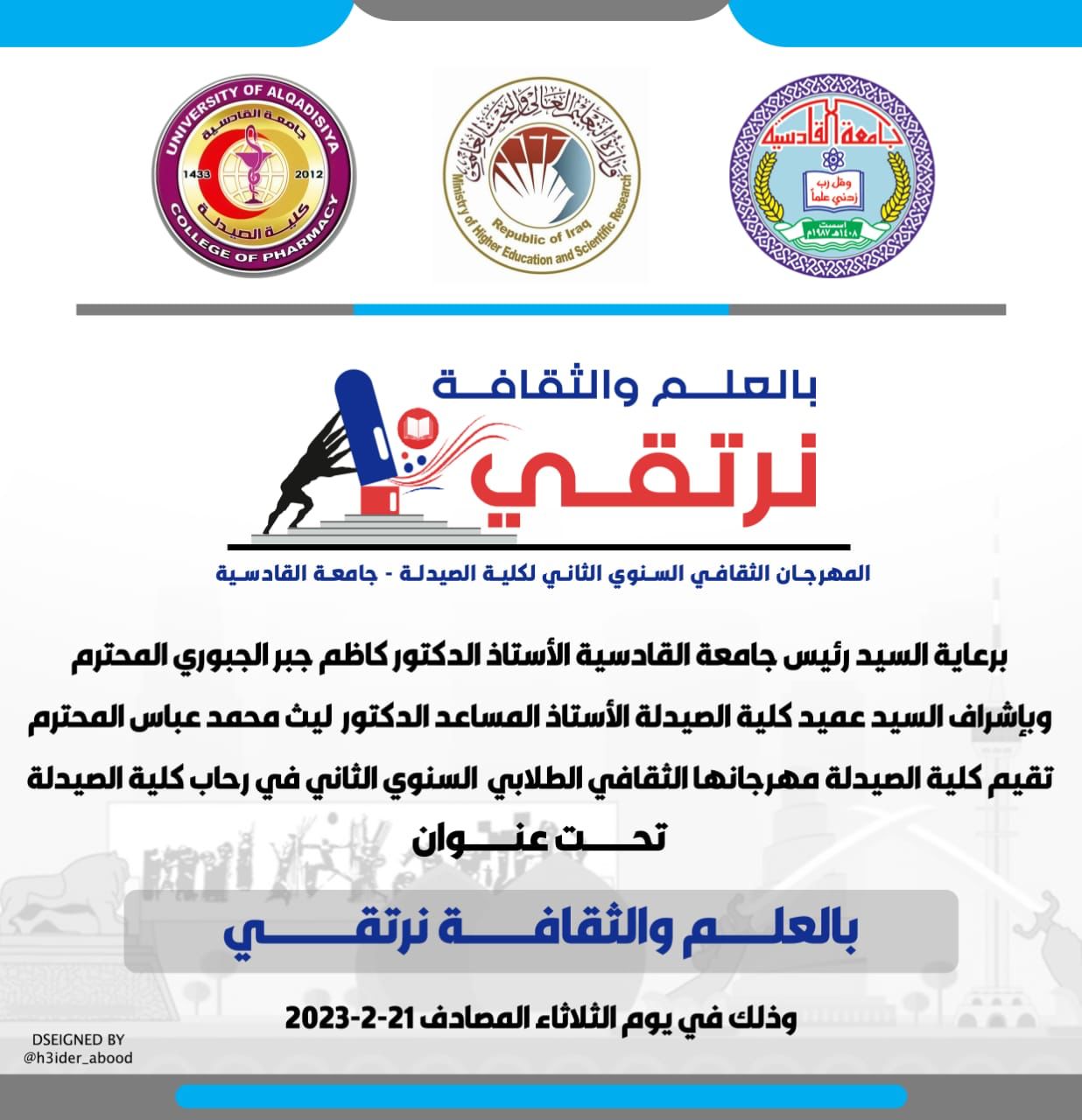 تقيم كلية الصيدلة مهرجانها الثقافي الطلابي السنوي الثاني تحت عنوان ( بالعلم والثقافة نرتقي)