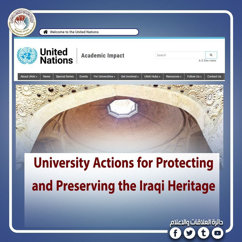 تأكيدا للتكامل العالمي الهادف وعملا بالمهام التي تضطلع بها الجامعات العراقية في الحفاظ على البيئة الثقافية والحضارية للعراق ولاسيما الجامعات التي حصلت على عضوية برنامج الأثر الأكاديمي للأمم المتحدة (The United Nations Academic Impact UNAI) فإن موقع المنظمة الدولية (https://www.un.org/en/academic-impact/university-actions-protecting-and-preserving-iraqi-heritage?mc_cid=fce4577f22&mc_eid=99ab047a33) يشيد بإجراءات الجامعة التكنولوجية لحماية التراث العراقي والحفاظ عليه من خلال أخذ زمام المبادرة بتأسيس أول وحدة لتكنولوجيا الحفظ التاريخي التزاما بأجندة وأهداف التنمية المستدامة وتصميم برنامج للدراسات العليا ضمن مجال الهندسة المعمارية وتنفيذ مشروع (UOT Virtual Museum) لحفظ التراث العراقي وتوثيقه رقميا.