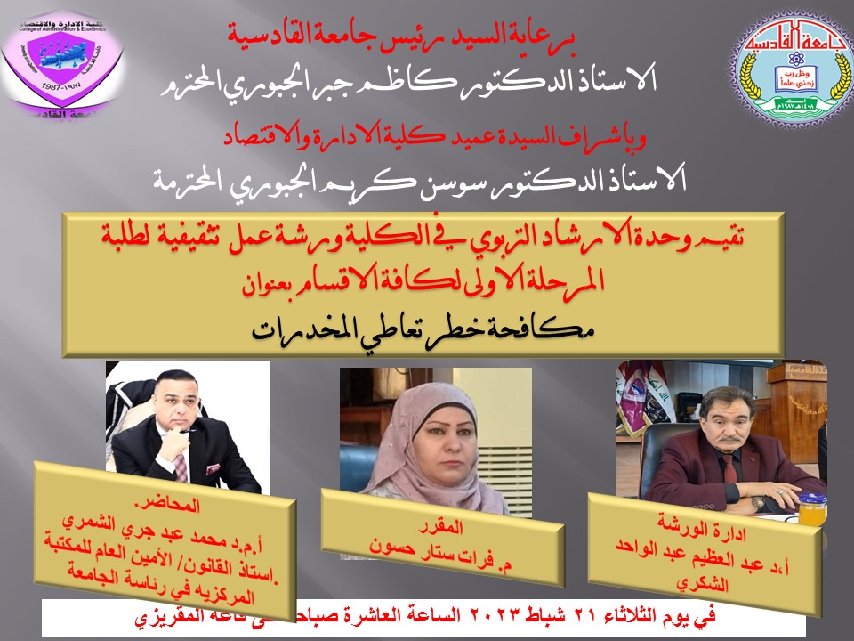 تقيم وحدة الإرشاد التربوي في كلية الادارة والاقتصاد / جامعة القادسية ورشة عمل تثقيفية لطلبة المرحلة الاولى لكافة الاقسام العلمية بعنوان (مكافحة خطر تعاطي المخدرات) .