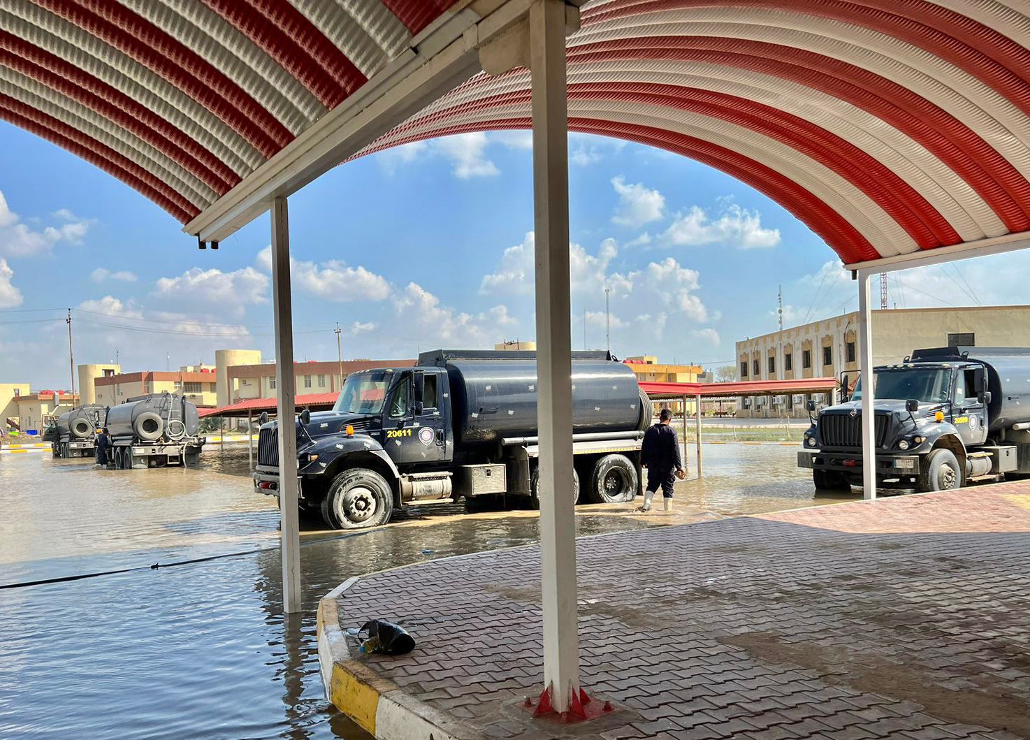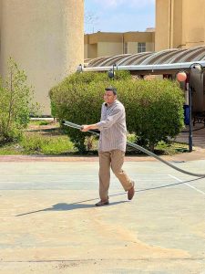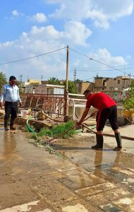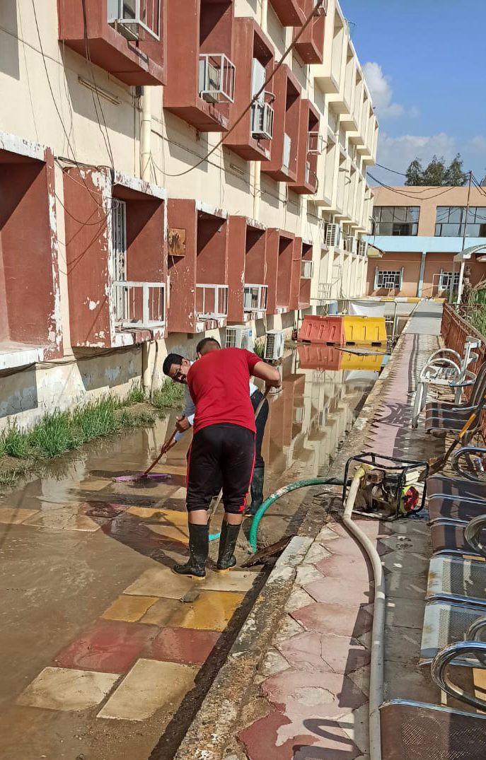 اذ باشرت ملاكات الصيانة والخدمات ومكتب السيد العميد وبالتعاون مع الدوائر ذات العلاقة بإطلاق حملة كبرى لسحب مياه الامطار اثناء العطلة الرسمية منذ الساعة ٨ صباحا حتى الساعة ٥ عصرا بالاستعانة بعدد كبير من السيارات الحوضية التابعة لوزارة الداخلية والعمل على سحب مياه الامطار من اروقة الكليات والكراجات والساحات والعمل على معالجة مواقع التصريف واجراء المستلزمات الضرورية لجعل الكليات جاهزة لاستقبال الطلبة ومنتسبيها بعد انتهاء العطلة الرسمية.