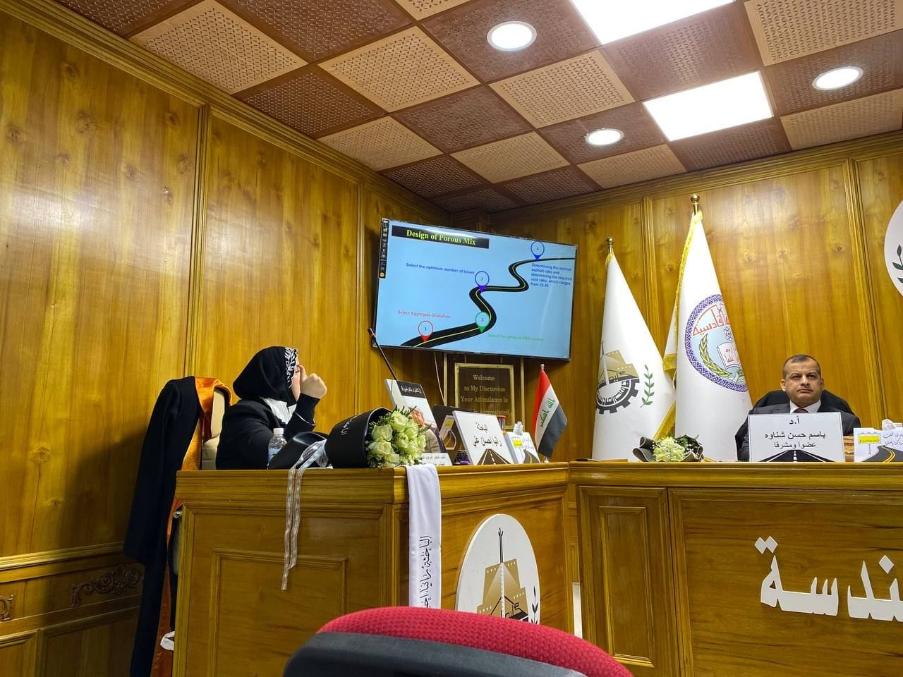 أحرزت الباحثة رانيا أحسان علي من قسم هندسة الطرق والنقل في كلية الهندسة بجامعة القادسية وبإشراف أ.د. باسم حسن الحميداوي رقم قياسي بأعداد ثمانية بحوث في مجلات ضمن مستوعبات سكوباس وكلارفيت وأعداد دراسة علمية لمديرية طرق المرور السريع تناولت فيها أسباب فشل الطرق السريعة بالعراق فضلا عن تقييم الخصائص الفيزيائية والكيميائية والريولوجية لقير الناصرية باستخدام فحوصات الاداء performance graded (PG) tests والتي تعد أول دراسة من نوعها بالعراق