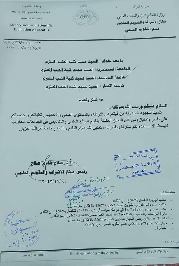 كرم السيد رئيس جهاز الاشراف والتقويم العلمي بوزارة التعليم العالي والبحث العلمي السيد عميد كلية الطب بجامعة القادسية أ.د. عقيل رحيم حسن البرقعاوي بكتاب شكر وتقدير تثمينا لجهوده المبذولة في الارتقاء بالمستوى العلمي والاكاديمي وبتقدير ( امتياز ) من قبل اللجان المكلفة بتقييم الواقع العلمي للجامعات الحكومية
