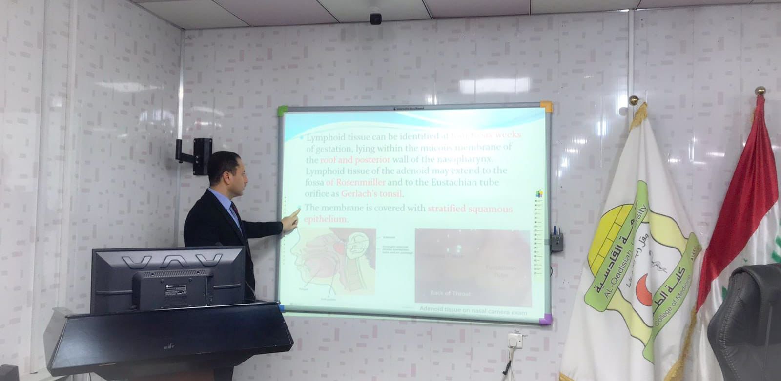 عقد فرع الجراحة بكلية الطب بجامعة القادسية ندوة علمية بعنوان (الزوائد اللحمية خلف الأنف وطرق علاجها ) حاضر فيها أ.د. مازن راحج المهجة اخصائي امراض الانف والاذن والحنجرة