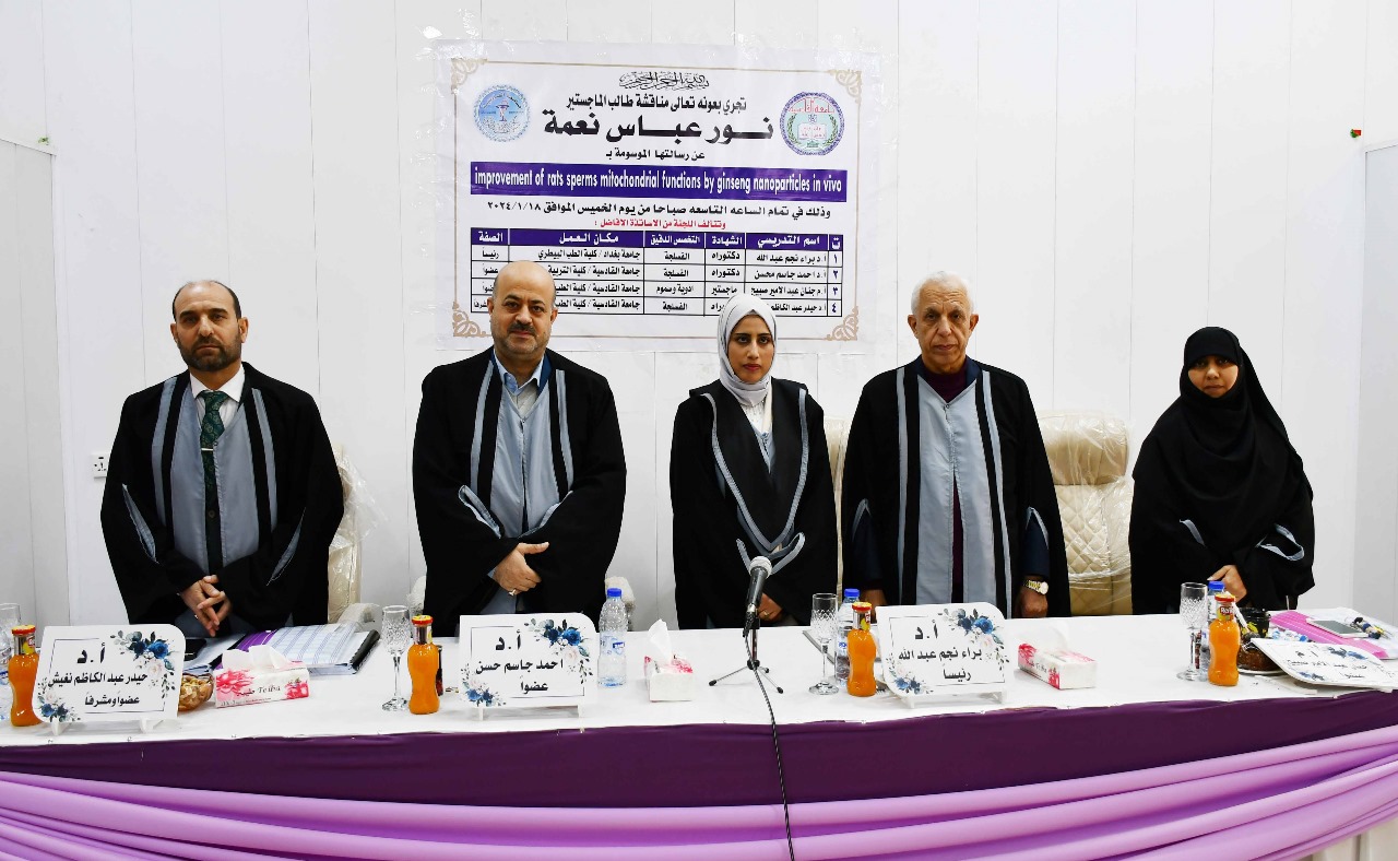 ناقشت رسالة الماجستير في كلية الطب البيطري بجامعة القادسية الموسومة بـ ( تحسين وظائف المايتوكوندريا في الحيوانات المنوية في الجرذان بواسطة جزيئات الجينسنغ النانوية في الجسم الحي) للطالبة نور عباس نعمه وبإشراف الأستاذ الدكتور حيدر عبد الكاظم الزاملي