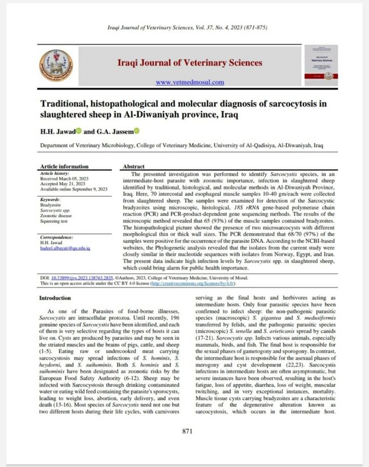 حيث تم خلال هذه الدراسة العلمية التعرف على وجود خمج الحويصلات الصنوبرية Sarcocystis ، وهو طفيلي ذو أهمية لأمراض حيوانية المصدر في الأغنام المذبوحة و تم تحديد الخمج بالطرق التقليدية والنسيجية والجزيئية في محافظة الديوانية، العراق. تم فحص العينات لوجود الـحوينات بطيئة التكاثر bradyzoite باستخدام تفاعل البلمرة المتسلسل للجين الرايبوسومي وطرق دراسة تعاقب القواعد النيتروجينية لمنتجات تفاعل البلمرة المتسلسل
